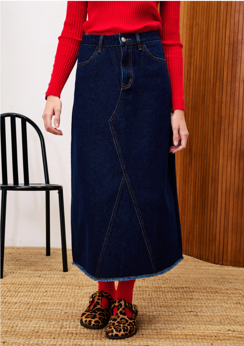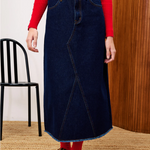 • A dark denim midi skirt is a staple in literally any closet or aesthetic. This one in particular is a rich, deep blue tone that adds the depth we search for in a good fall or winter outfit. We would style this outfit for a girls night with chunky boots and a an off the shoulder top. We'd even throw on the new Bowie Bomber to add more depth and interest to the look.