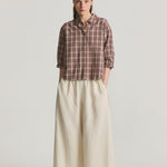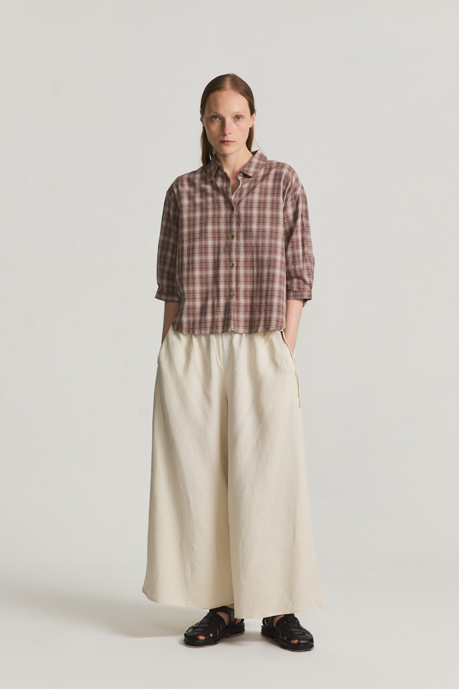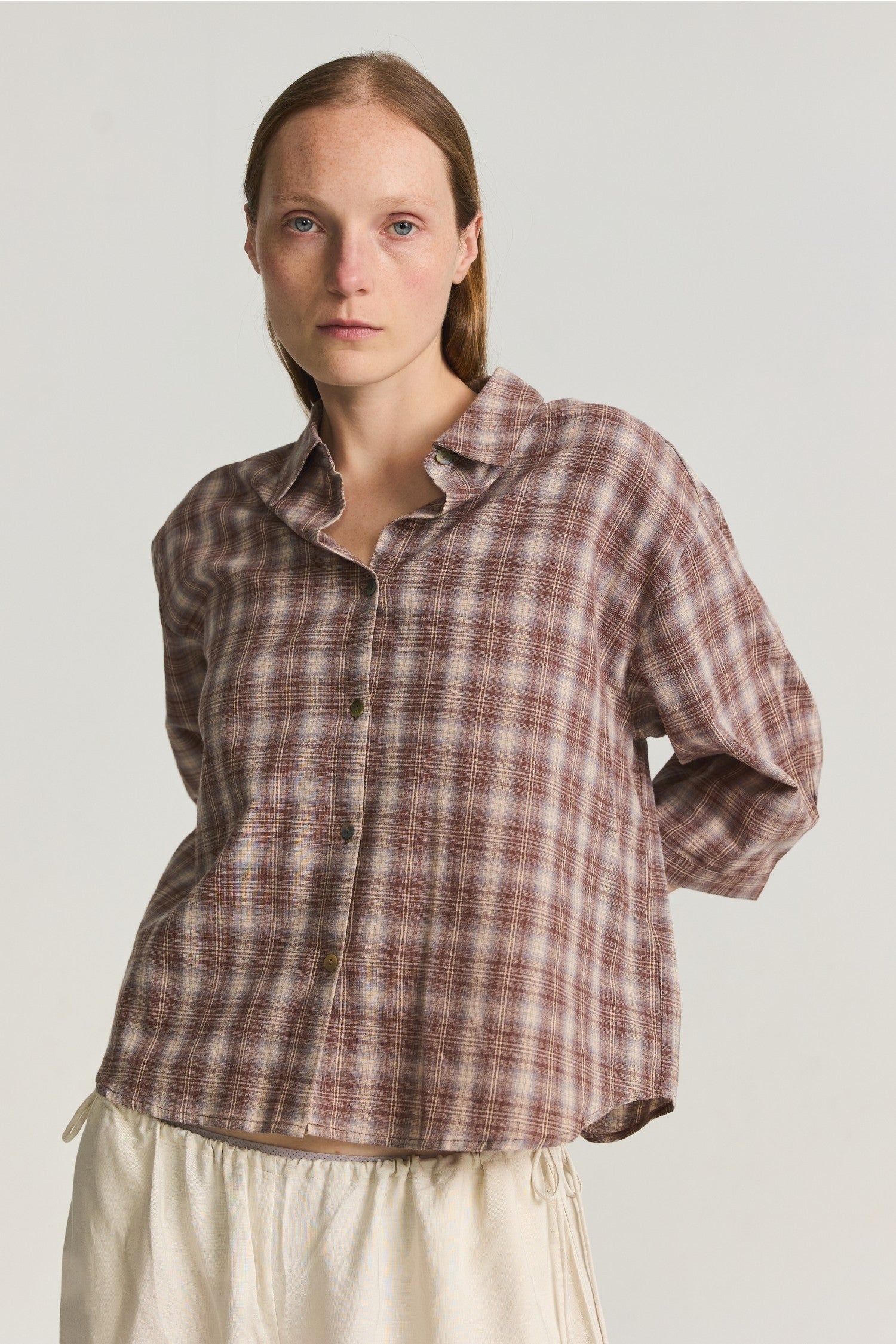 Refresh your wardrobe with The Clara Top. Featuring 3/4 sleeves and a lightweight plaid cotton fabric, it offers both comfort and style. The boxy fit adds a contemporary touch, while the mother-of-pearl buttons elevate the look. Effortlessly versatile, this shirt seamlessly transitions from casual to polished.