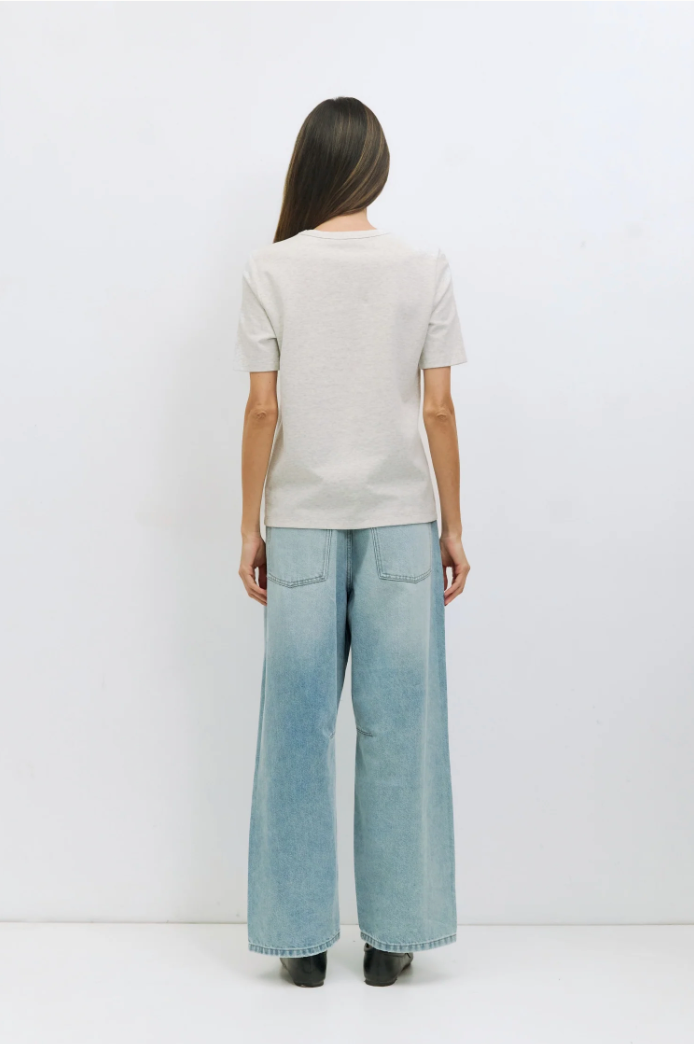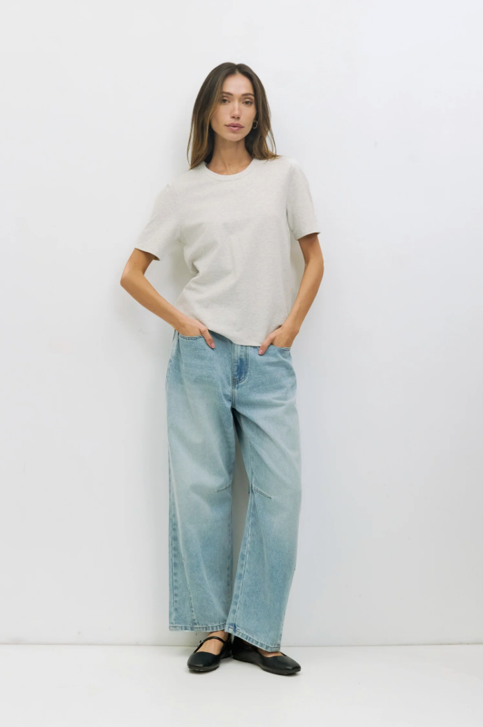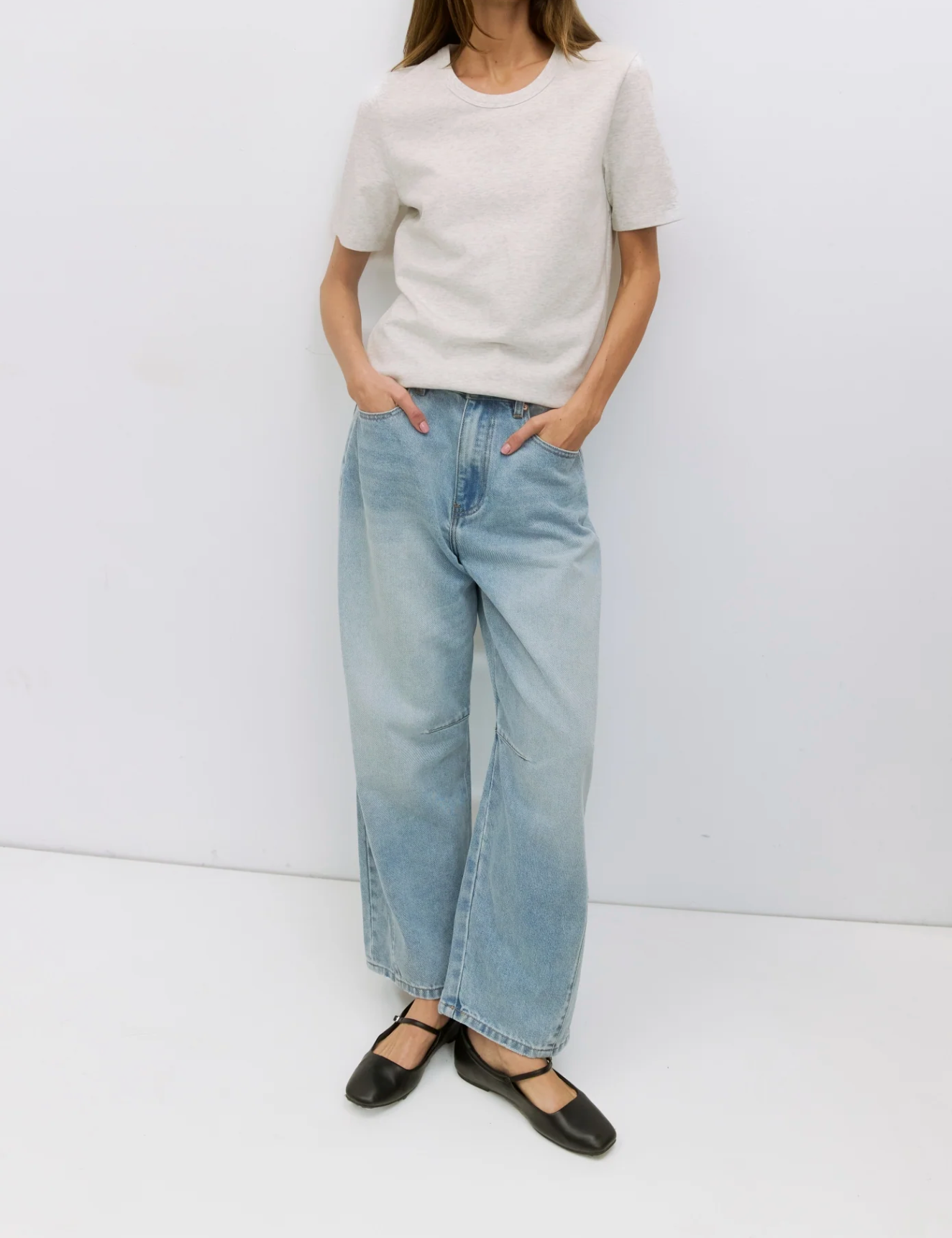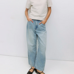 The Ansen Jeans are crafted from washed midweight denim in a barrel wide-leg silhouette, featuring knee and leg opening darts for subtle structure. Designed with front button and hidden zipper closure, copper-rivet trimmed pockets, and belt loops, they balance thoughtful detailing with a relaxed, modern fit.