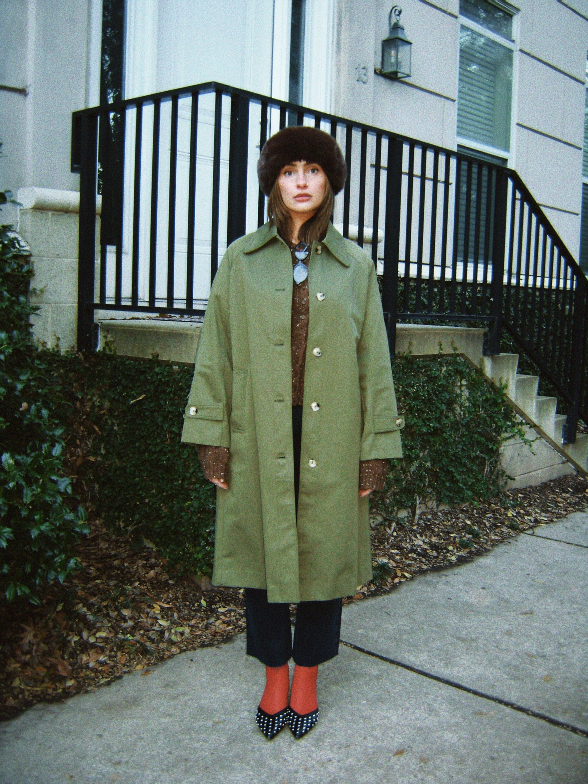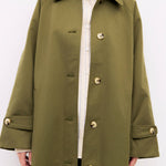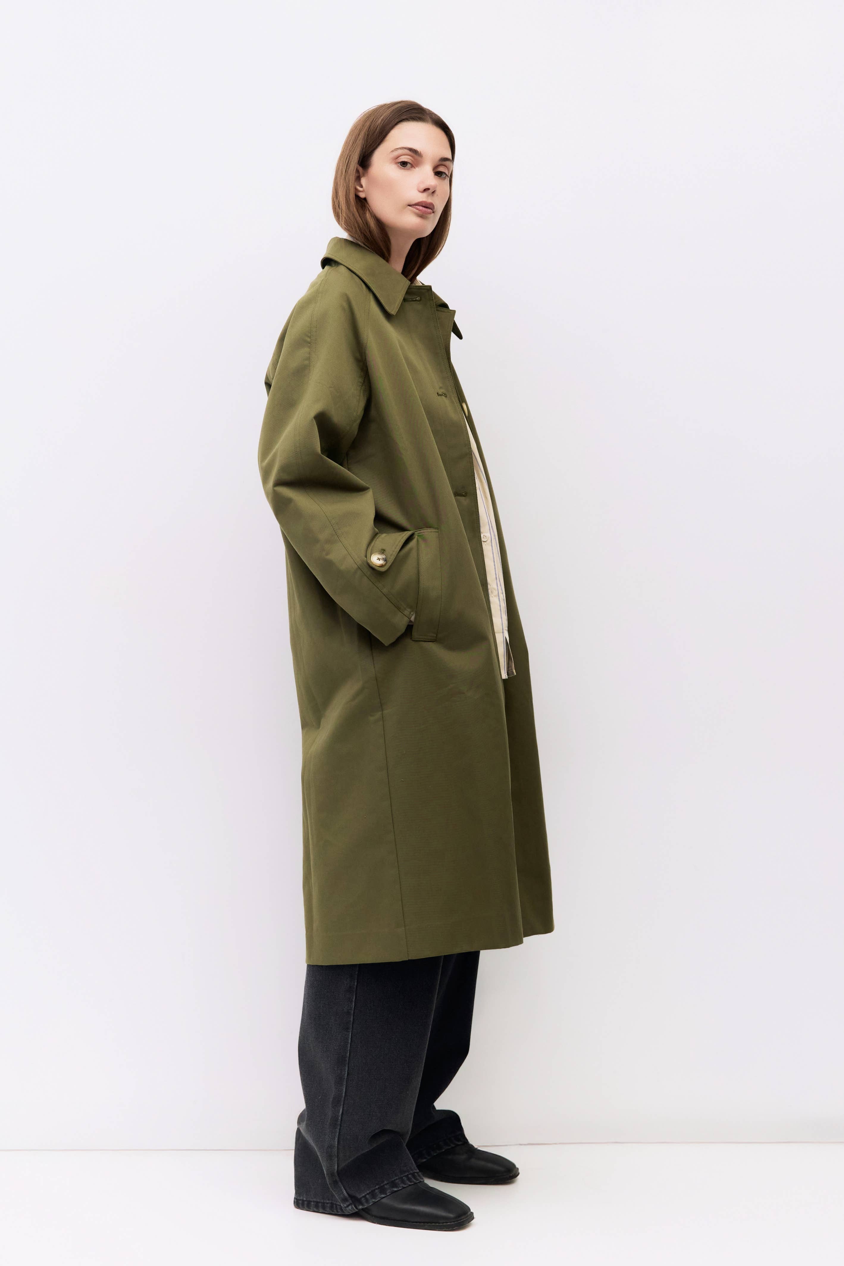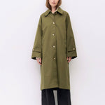 The Seraphine Trench Coat blends timeless tailoring with contemporary ease, featuring a pointed collar and raglan sleeves for a relaxed yet refined silhouette. Finished with adjustable cuffs, welt pockets, and a back slit, this midi-length trench coat is designed for effortless layering.