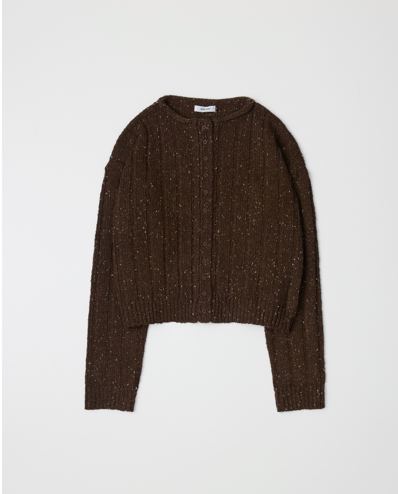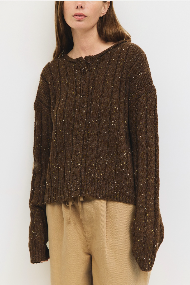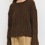 The Theodora Cardigan is a chunky ribbed knit cardigan designed with a speckled finish for added texture and depth. Featuring a rolled crewneck, dropped shoulders, and a relaxed fit, it layers comfortably over any look.